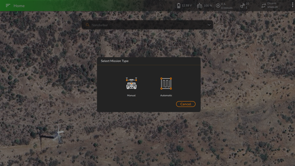 Within the mission planning interface of AeroGCS ORANGE, the initial step involves choosing between two distinct mission types: manual and automatic. This pivotal selection sets the tone for the entire planning process. Users have the flexibility to opt for either manual or automatic mission types, each serving specific purposes. The displayed screen guides users through this crucial decision-making process, laying the foundation for a tailored and efficient mission plan in AeroGCS ORANGE.