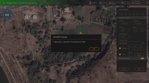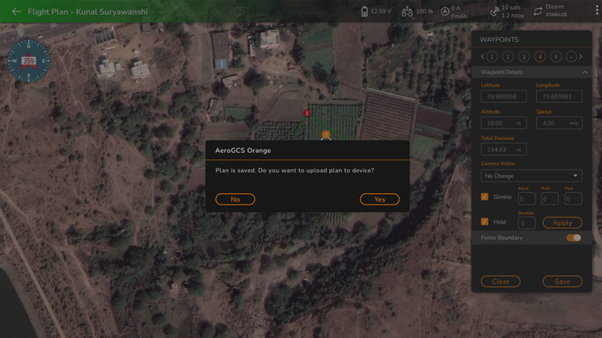 Click on "**Yes**" if the user wants to upload the plan to the device. It will upload the plan to the device and will ask the user, "Flight plan uploaded, proceeding for flight" as shown in the following screen.