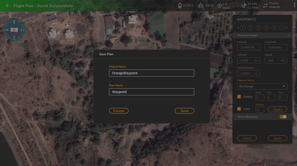 After completing the waypoint details and fence boundary, the user must save the plan by clicking on the "**Save**" button. This will prompt the following screen, allowing the user to enter a project name and plan name for saving the plan.