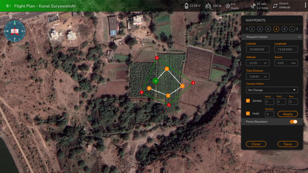 As the user draws the fence around the waypoint plan by clicking at the location on the map, it will be added in green color around the waypoints, as shown in the following screen.
