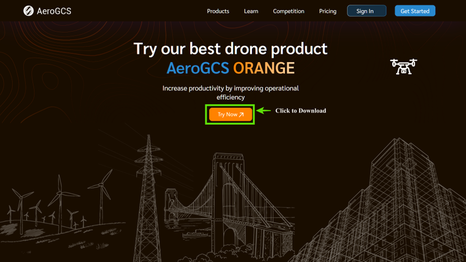 To install AeroGCS ORANGE on your Windows operating system, head over to https://aerogcs.com/aerogcs-orange. Click the 'Try Now' button, following the guidance in the provided screenshot.