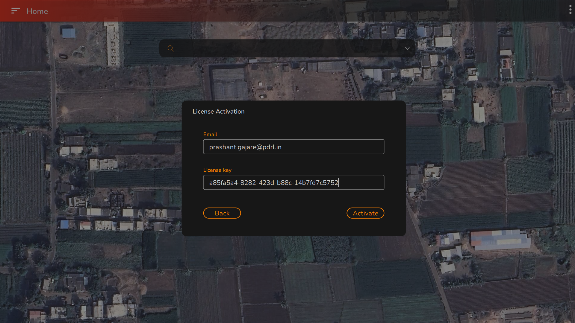After entering all the necessary details, such as your email ID and license key, click on the **"Activate"** button to continue. If you want to return to the previous screen, use the **"Back"** button. Upon successful activation of your AeroGCS ORANGE product, a message will appear on your screen saying **"License Activated Successfully".** In the case of invalid or previously used license details, the screen will display an appropriate message accordingly.&#x20;