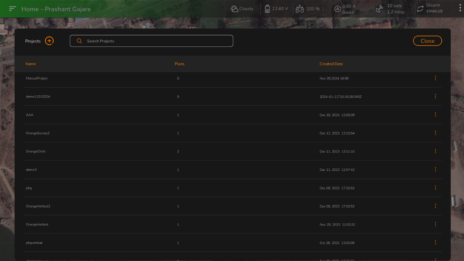 In AeroGCS ORANGE, users can easily create and manage projects. The interface allows for the creation of new projects, viewing existing ones, and searching for specific projects by name. This user-friendly feature simplifies project management within the application.