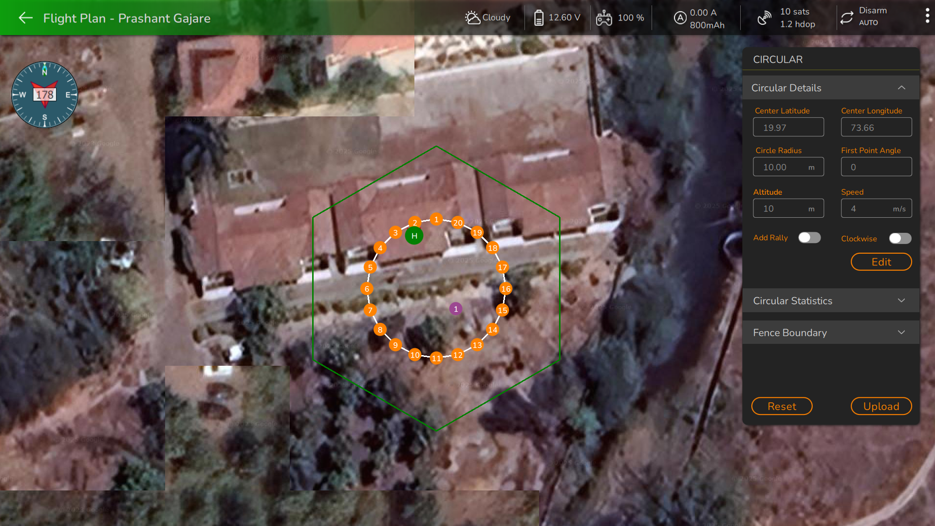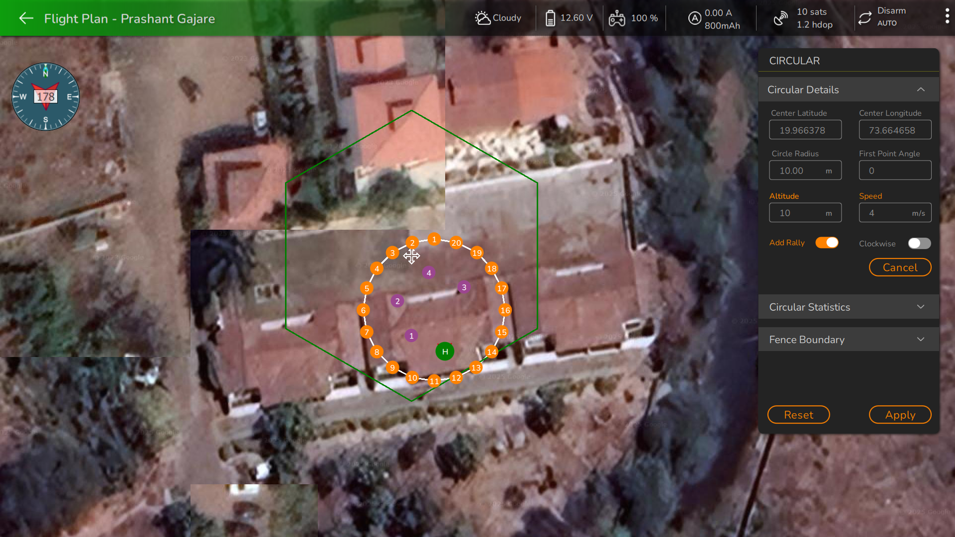&#x20;In this section, users can modify the plan location by editing the center altitude and center longitude or by selecting and dragging the center point of the plan, represented by the center anchor <img src="https://2088440664-files.gitbook.io/~/files/v0/b/gitbook-x-prod.appspot.com/o/spaces%2FRl901ujCzyxXKNVGgTDX%2Fuploads%2FFOn7fLMI4SHBSgHXXtwL%2Fimage.png?alt=media&#x26;token=757a1143-6370-41d5-a174-3b67dc59bd55" alt="" data-size="line"> . Adjustment of the circular plan's area is possible by editing the circular radius or moving the circular anchor at the edge of the plan. Dragging it inward reduces the plan area while dragging it outward increases it. Users can also input new values for the first point angle, altitude, and speed. Rally points can be enabled or disabled, and users have the option to change the direction of circular plan points clockwise by enabling the clockwise option.